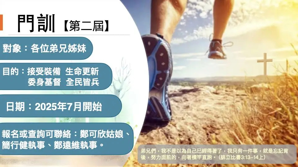 第二屆【門訓】將於7月開課,讓眾弟兄姊妹接受裝備,生命更新而轉化,成為委身基督的服侍者,合主用的門徒。有意參加可到壁報板海報上填寫名字,詳情可與鄭可欣姑娘、簡行健執事或鄭遠維執事查詢。