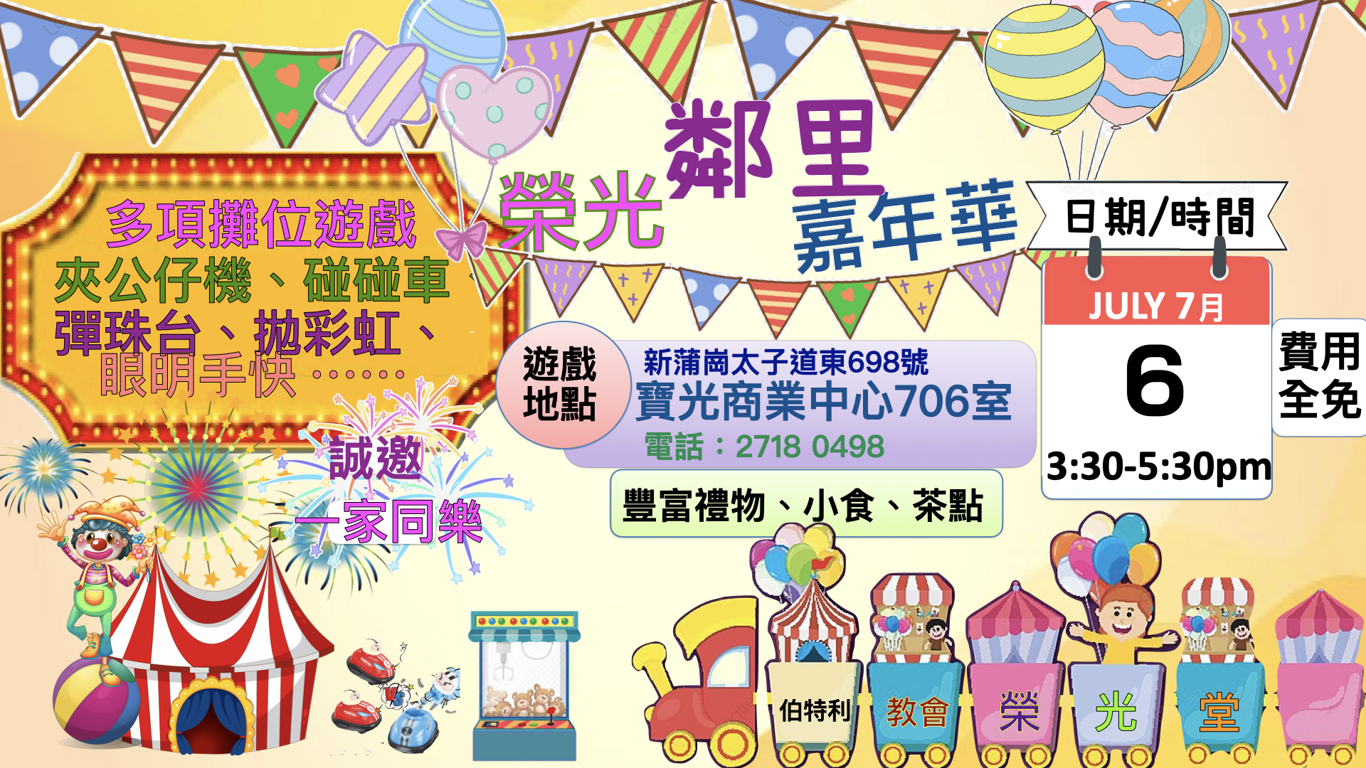 7月6日(主日)下午3時30分至5時30分將於教會舉辦嘉年華,藉此接觸附近街坊小朋友及家庭,現招募工作人員協助當天接待來賓、維持秩序,請弟兄姊妹於壁報板報名表填上名字,一同參與。另6月29日午堂崇拜後會作最後動員到街上派發傳單,請大家預留時間!